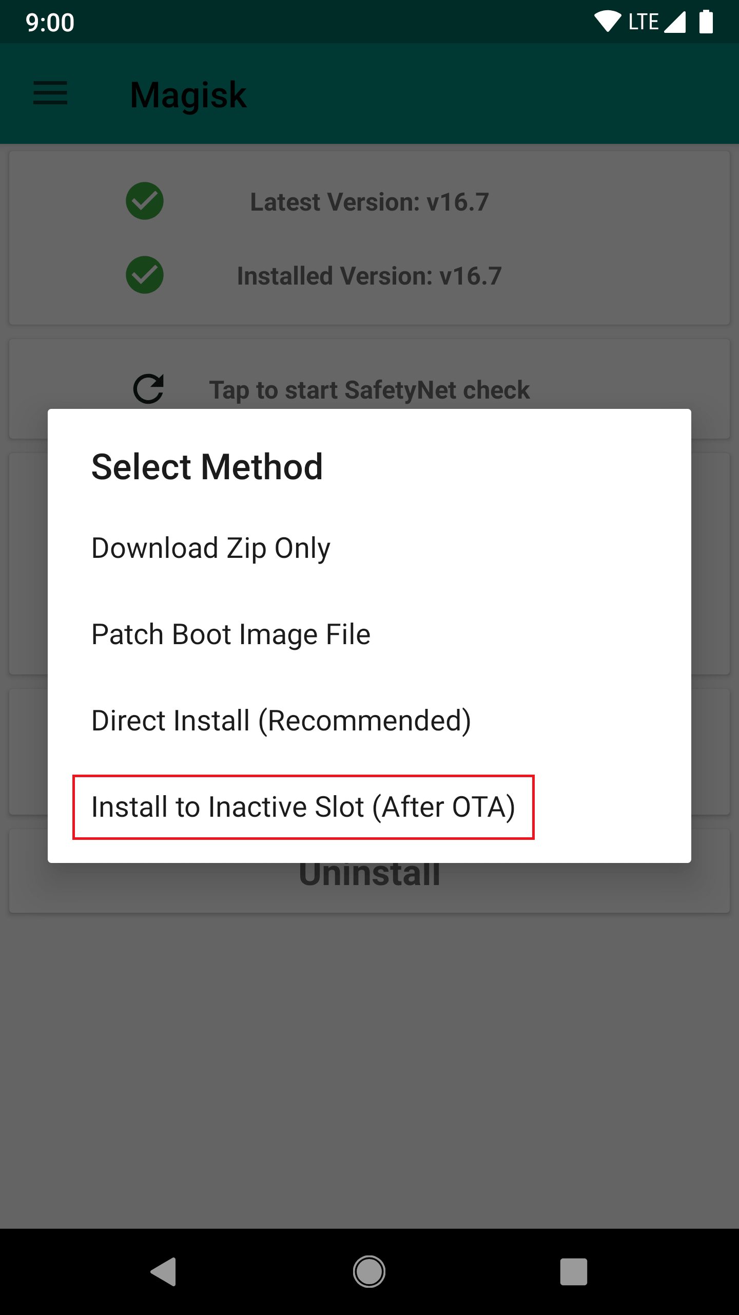 - Wait for the installation to be fully done (both step 1: "installing update", and step 2: "optimizing your device", of the OTA), do not press the "Restart now" or "Reboot" button! Instead, go to (Magisk app → Install → Install to Inactive Slot) to install Magisk to the updated slot.