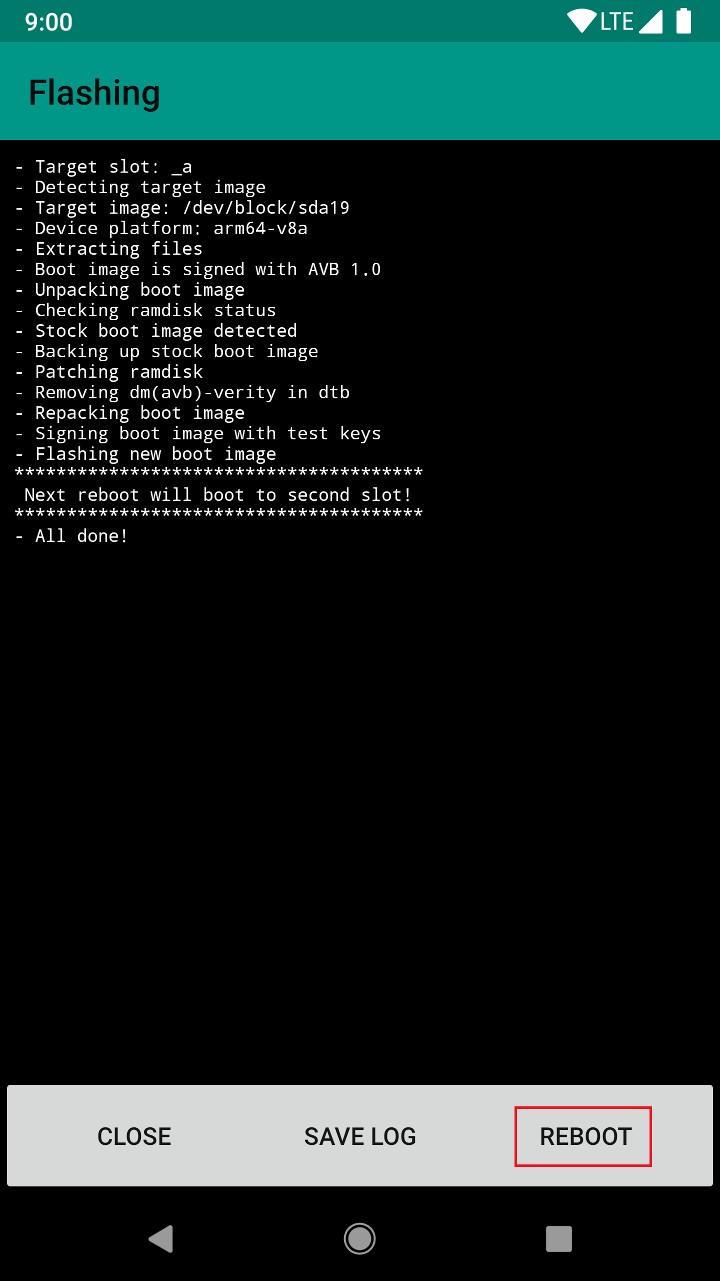 - After installation is done, press the reboot button in the Magisk app. Under-the-hood, the Magisk app forces your device to switch to the updated slot, bypassing any possible post-OTA verifications.