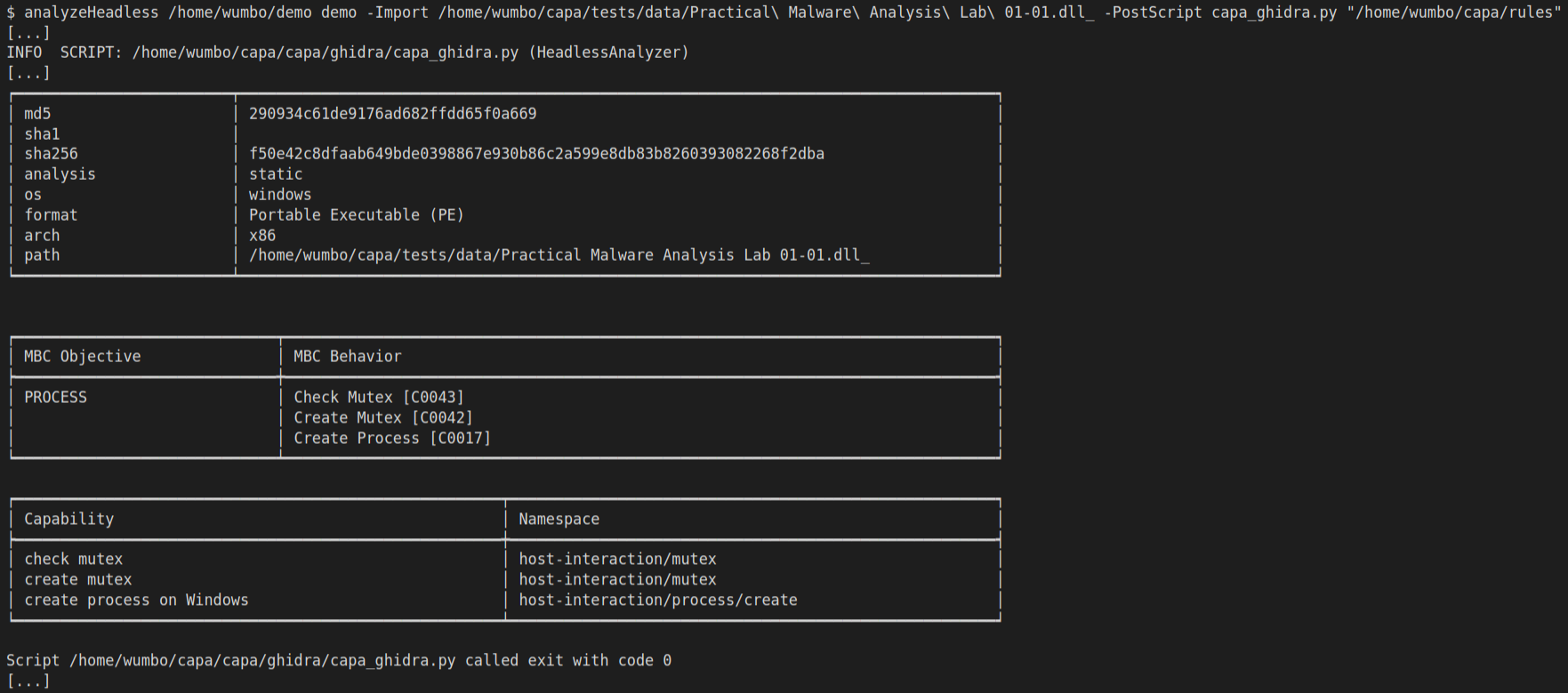 $ analyzeHeadless /home/wumbo/demo demo -Import /home/wumbo/capa/tests/data/Practical\ Malware\ Analysis\ Lab\ 01-01.dll_ -PostScript capa_ghidra.py "/home/wumbo/capa/rules --verbose"