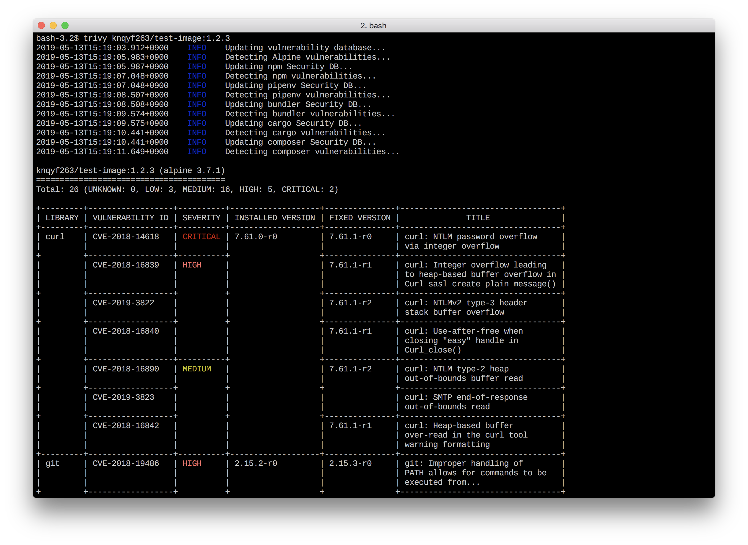 Trivy (tri pronounced like trigger, vy pronounced like envy) is a simple and comprehensive vulnerability scanner for containers and other artifacts. A software vulnerability is a glitch, flaw, or weakness present in the software or in an Operating System. Trivy detects vulnerabilities of OS packages (Alpine, RHEL, CentOS, etc.) and application dependencies (Bundler, Composer, npm, yarn, etc.). Trivy is easy to use. Just install the binary and you're ready to scan. All you need to do for scanning is to specify a target such as an image name of the container.